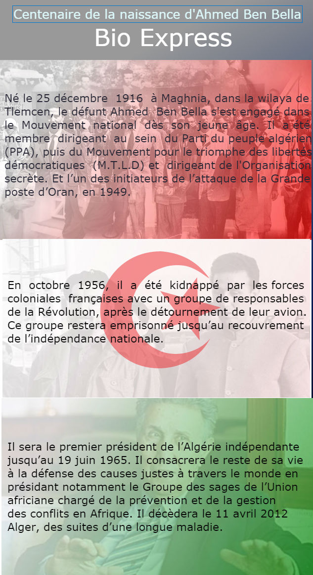 Plusieurs personnalités politiques, historiques et universitaires revisiteront, ces dimanche et lundi, à Tlemcen, lors d’un colloque international, la personnalité d’Ahmed Ben Bella dans ses dimensions nationale et internationale", organisé à l’occasion du centenaire de la naissance du 1er président de l’Algérie indépendante.
