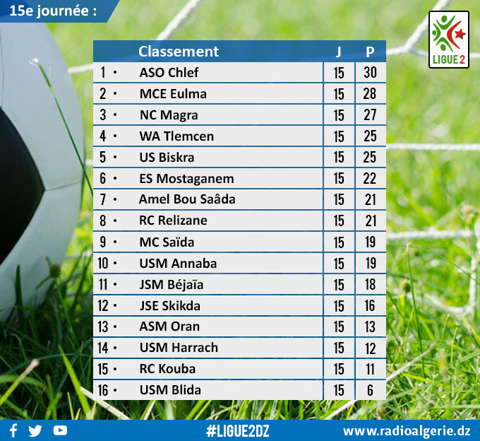 L’ASO Chlef est sacrée champion d’hiver de la Ligue 2. Les Chélifiens ont remporté ce titre honorifique en allant battre le WA Tlemcen chez lui (2-3), ce venbredi à l’occasion de la 15e et dernière journée de la phase aller.