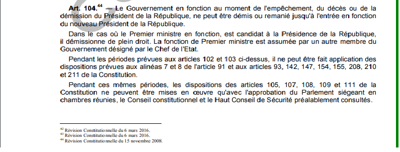 L'article 102 dispose que "lorsque le Président de la République, pour cause de maladie grave et durable, se trouve dans l'impossibilité totale d'exercer ses fonctions, le Conseil constitutionnel se réunit de plein droit, et après avoir vérifié la réalité de cet empêchement par tous moyens appropriés, propose, à l'unanimité, au Parlement de déclarer l'état d'empêchement".