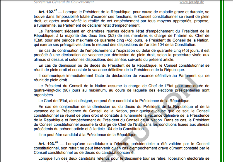 Le même article ajoute que le Parlement siégeant en chambres réunies déclare l'état d'empêchement du Président de la République, à la majorité des deux tiers (2/3) de ses membres et charge de l'intérim du Chef de l'Etat, pour une période maximale de quarante cinq (45) jours, le Président du Conseil de la Nation, qui exerce ses prérogatives dans le respect des dispositions de l'article 104 de la Constitution...